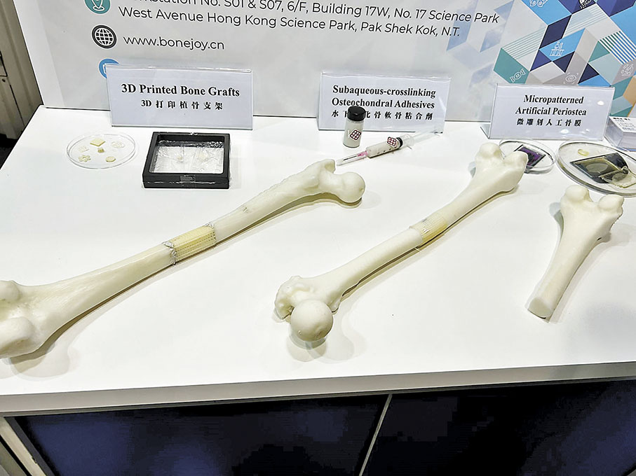 Bonejoy 技術總監楊雨禾表示,新材料具有高強度及生物活性,提供最佳機械支撐; 可降解、代謝及生物相容;所有成分均可被 人體代謝;膏狀的材料可以 3D 打印預先製 成支架,塑成適合傷處的形狀,或於手術期間直接注射至傷患處。材料較市面上較常見 的人工植骨材料為佳,因一般天然聚合物硬 度不夠支撐力,陶瓷仿生骨則較難加工至適合患者傷處的形狀,合成聚合物令骨骼癒合時間較慢。