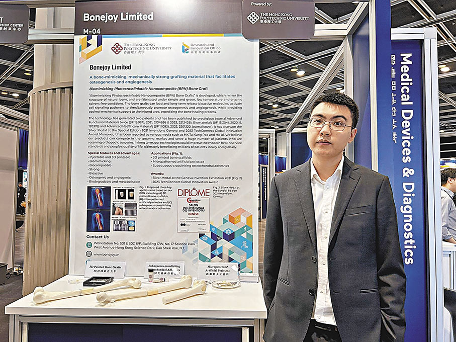 理工大學生物醫學工程學系團隊研發出一種仿天然骨光交聯納米複合材料(BPN), 能夠模擬自然骨骼結構,並在簡單、綠色、 低溫和無有機溶劑的條件下製造。該材料能夠負載並長期釋放生物活性分子,激活細胞信號傳導通路,促進骨和血管生成,提供最佳機械支撐,加速骨修復。該技術已獲得兩項專利,並在知名刊物上發表,及在瑞士日內瓦國際發明展 2021 年網上特別版上獲得銀牌。公司旨在競爭不斷擴大的市場,為接受矯形手術的大量患者提供服務。